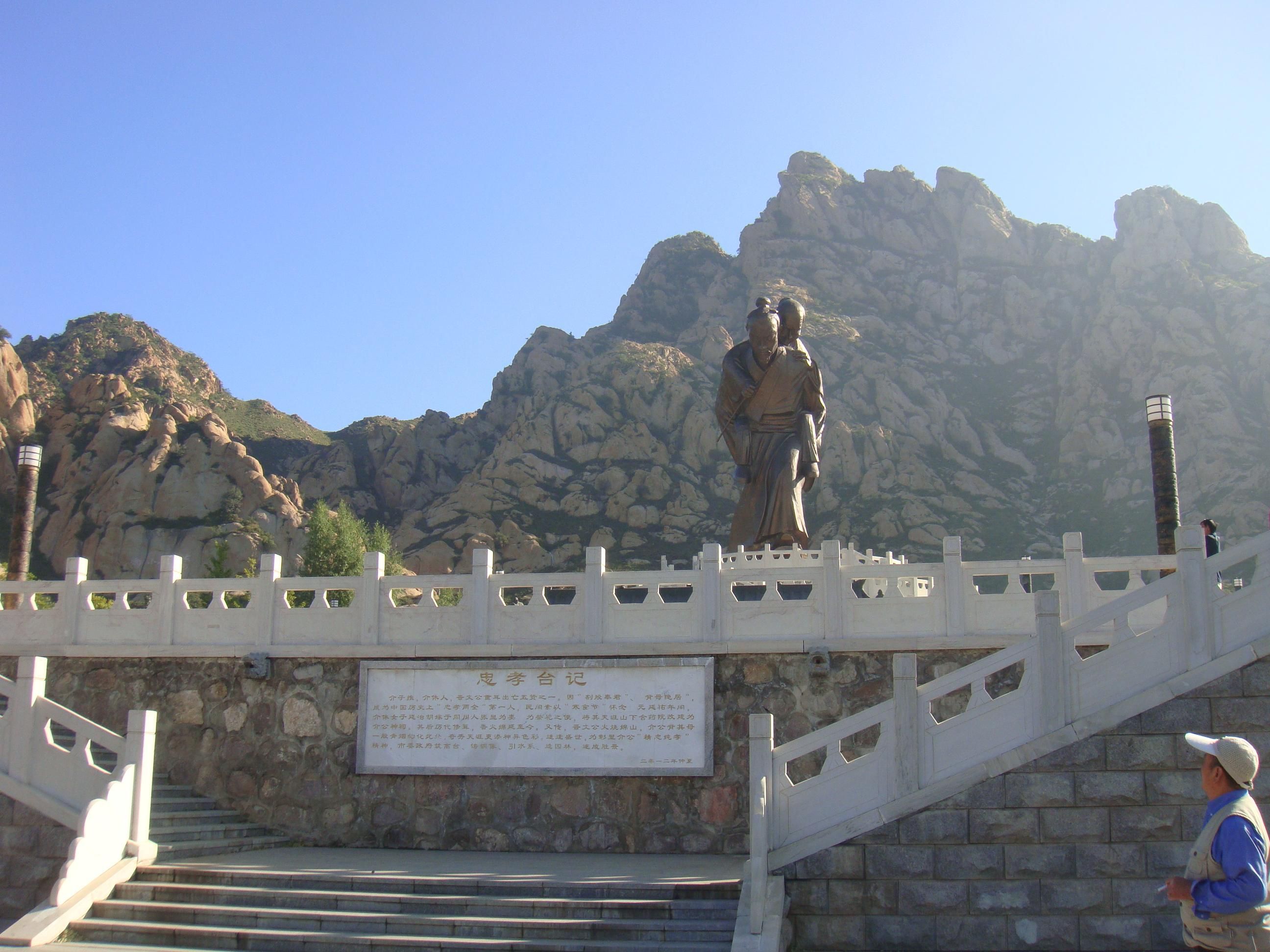 介子推背母铜像高大、逼真,立于忠孝台中央。