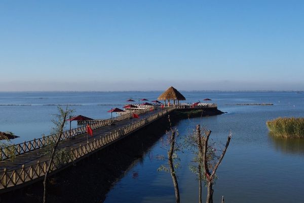 湖面芦苇荡内繁衍着各种鸟类,凌空起飞时盘旋在烟波浩渺的湖面上,岸边凉亭水榭柳绿成荫,碧水青山相映成辉,组成一幅十分壮观的图景。
