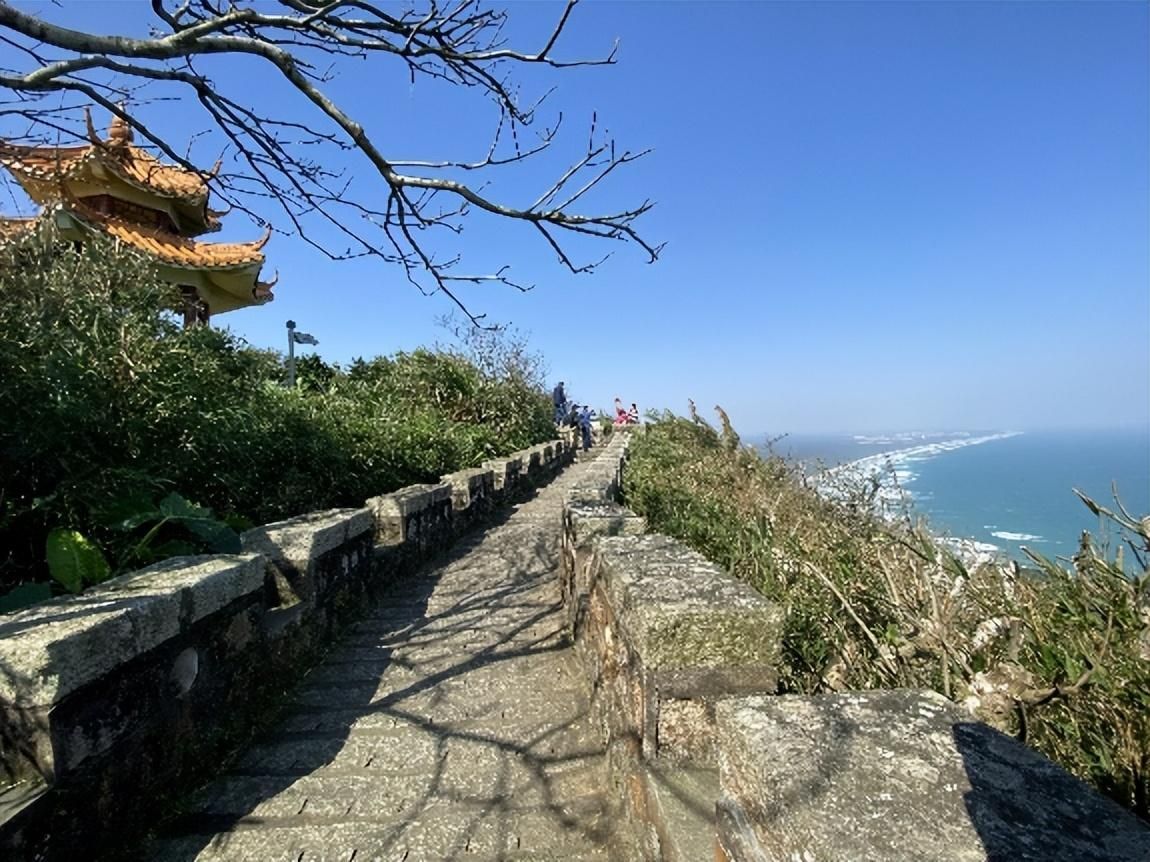 在揽月台,可看到美丽的月亮湾像一钩初月,银白色的沙滩像一条缎带,涛涛的白浪犹如万马奔腾。此处水陆相间、蓝绿相融、动静结合,美不胜收。