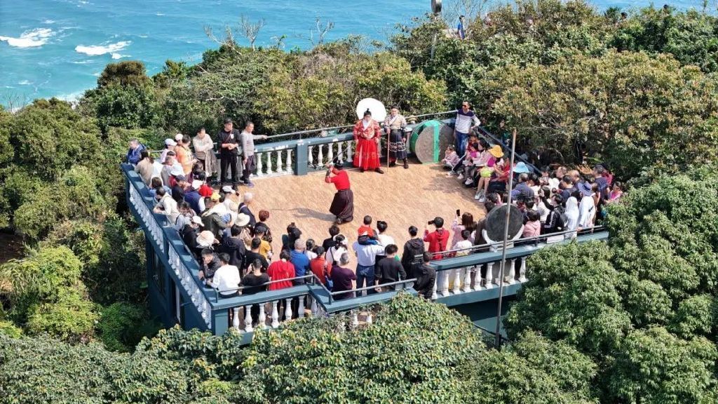 在铜鼓长廊,您可近观铜鼓岭山峦起伏,远眺七洲列岛。顺着鳄鱼嘴往前看,那一片弯弯的海岸便是月亮湾了,遇到大风时,海水如同万马奔腾一样滚滚而来,亲吻着月亮湾的海岸。同时,这里也是迎接海南本岛第一缕阳光的地方。