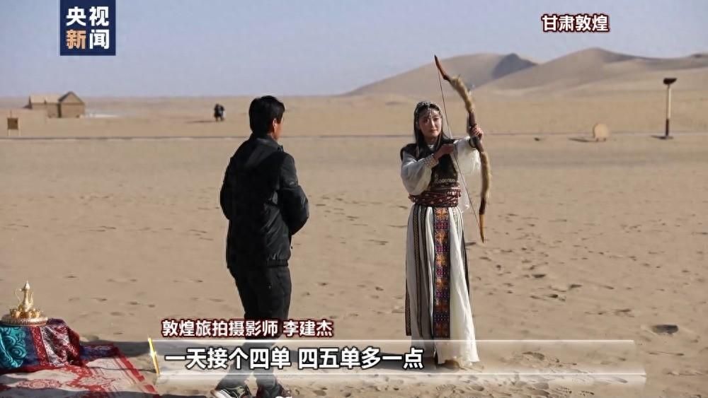 敦煌旅拍摄影师 李建杰:游客量变化还是挺大的,往年没有这么多人。我作为一个摄影师,一天接四单,四五单多一点。