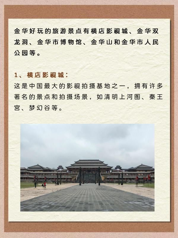 金华好玩的旅游景点有横店影视城、金华双龙洞、金华市博物馆、金华山和金华市人民公园等。