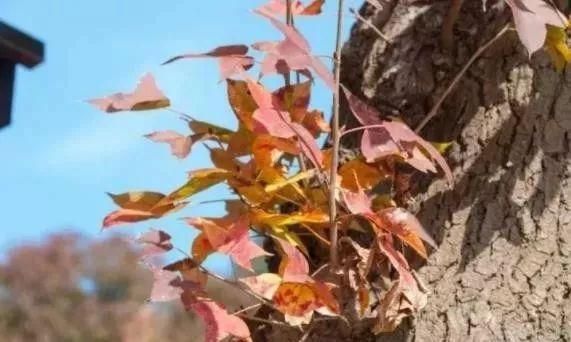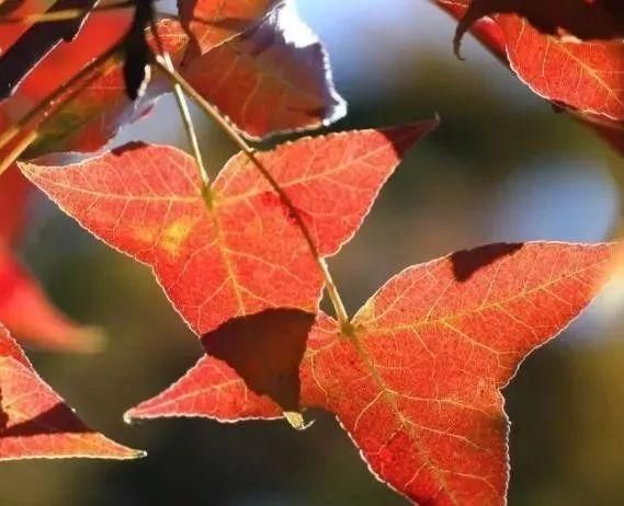 在枫树湾、水库边、船山上,枫香树等叶子大部分被染成火红的红色,将山峦装点得层林尽染、色彩斑斓。