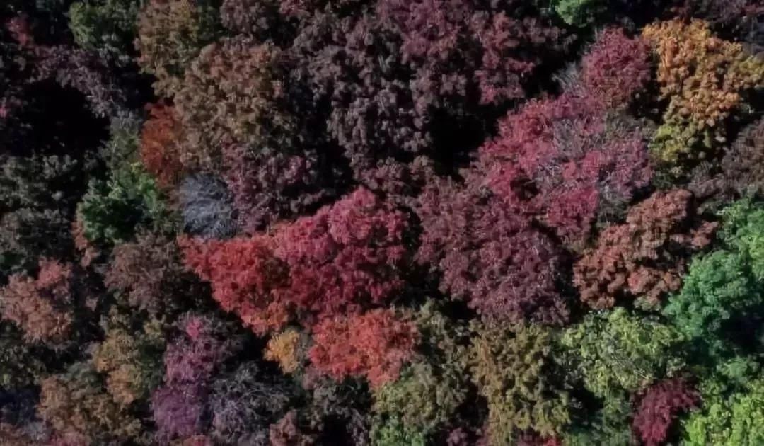 航拍的连云港云台山宛如打翻的调色板,秋色斑斓、美如画卷。