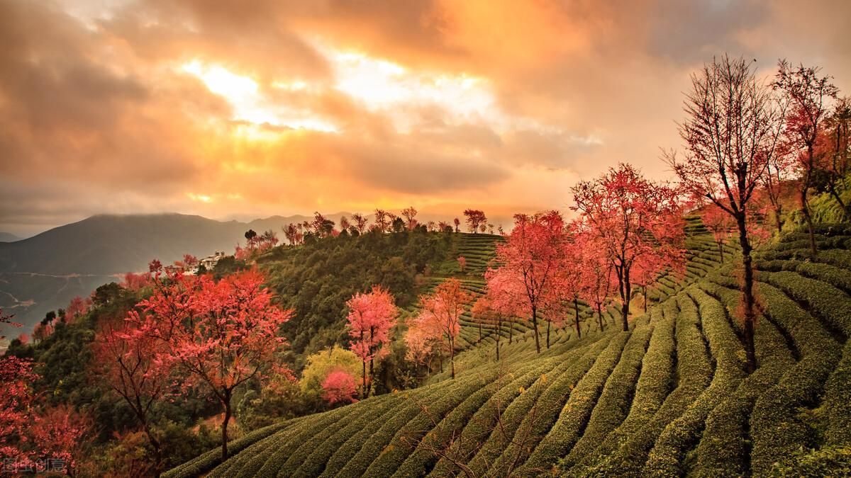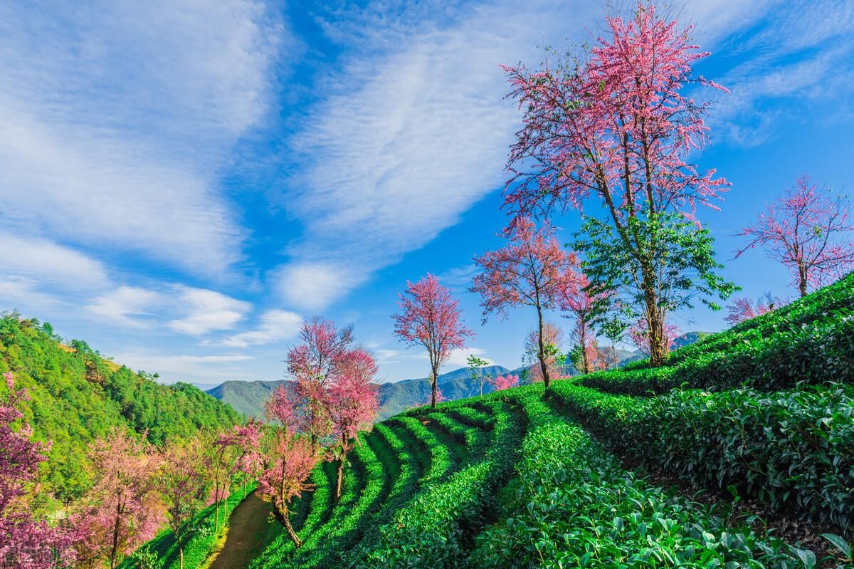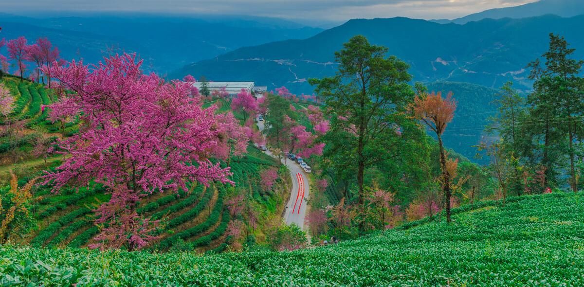 在寒冬时节樱花盛开,这样的奇特景观你见过吗?冬樱花盛开灿若云霞,与终年碧绿的茶树形成鲜明对比,更增添了樱花的娇媚。