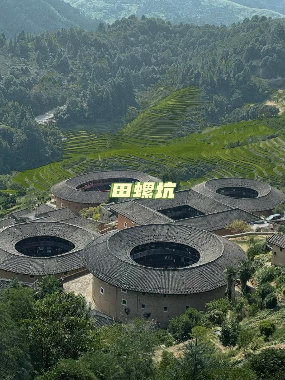 田螺坑土楼群 :四个圆形土楼连在一起,又叫四菜一汤。在观景台上能拍到全景,也可以爬下山去土楼里面看看