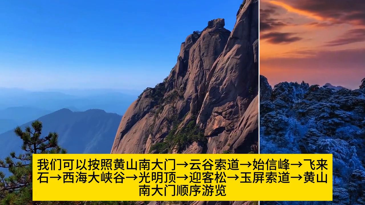 ·4、个人建议人生不要过早的去爬黄山,因为黄山确实是一步一景,超级美,再爬其他山感觉索然无味。最佳游览季节是全年,门票190元,可以玩三天。可以按照黄山南大门→云谷索道→始信峰→飞来石→西海大峡谷→光明顶→迎客松→玉屏索道→黄山南大门顺序游览。山上有吃的,但是建议自备干粮和水。住宿建议山脚居住,价格稍微便宜一点。