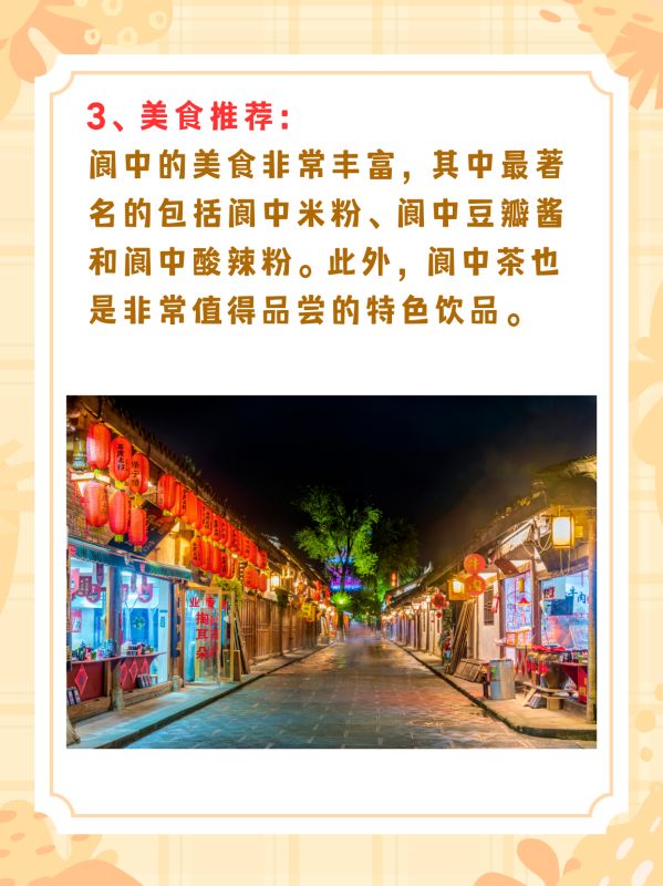 3、美食推荐:阆中的美食非常丰富,其中最著名的包括阆中米粉、阆中豆瓣酱和阆中酸辣粉