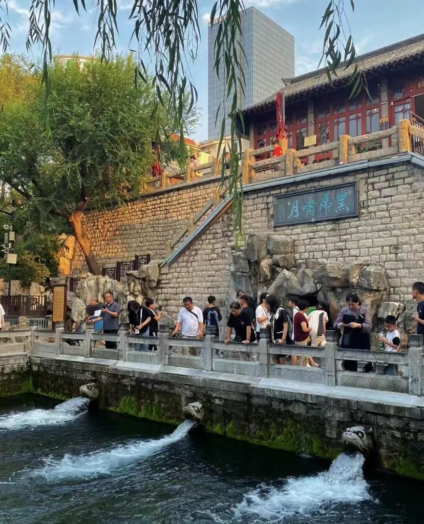从泉城广场出来沿着河边一直往东走,就到黑虎泉啦,全年全天开放不收门票,路上还有很多的泉眼,值得一看,一路走走停停很是惬意。可以在世界最大的铜虎前拍照,也可以在虎泉阁免费盖章,“锦鲤+荷叶+荷花”完美组合。冷泡茶10元一瓶,瓶子很有特色,可以用来拍照。还可以在这里坐船游护城河,游船开起来划过身边,荡漾起一圈圈涟漪。游览完黑虎泉,过桥上台阶就到解放阁啦,解放阁对面就是宽厚里小吃街,逛街吃饭两不误。