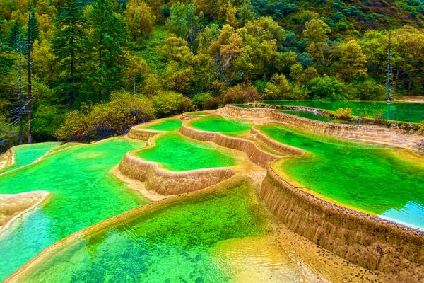 五花海,属滑坡、泥石流阻塞原冰川沟谷形成的堰塞湖。五花海是九寨沟色彩最丰富的海子,湖底的钙华、藻类、水草、枯树在对光的不同反射和折射下,加上蓝天、白云、绿草、翠林在湖中的投影,构成了鹅黄、翠绿、墨绿、天蓝、深蓝、藏青等色调交织混染的湖水,似无数块宝石镶嵌成的巨形佩饰。俯瞰其全貌,俨然孔雀开屏。