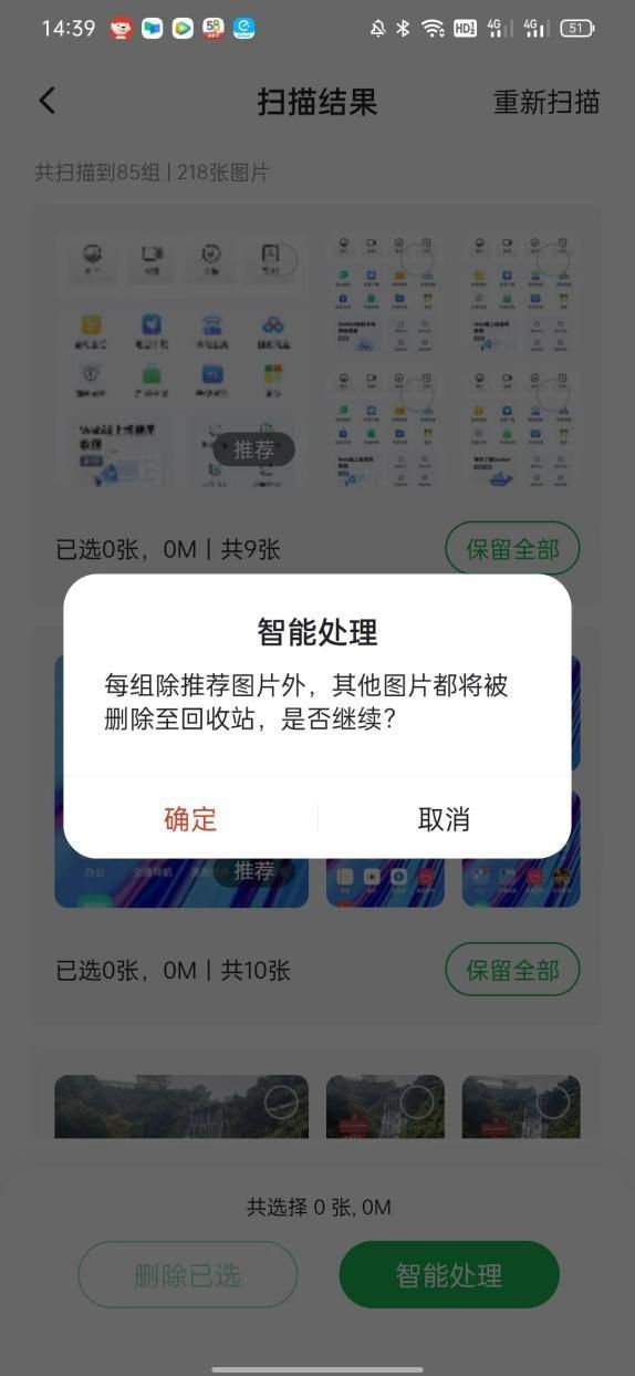 扫描完成后,可以自行决定每组图片的去留,也可以选择“智能处理”,一键删除相似图片,角度差不多的图片一眨眼的功夫就删完啦