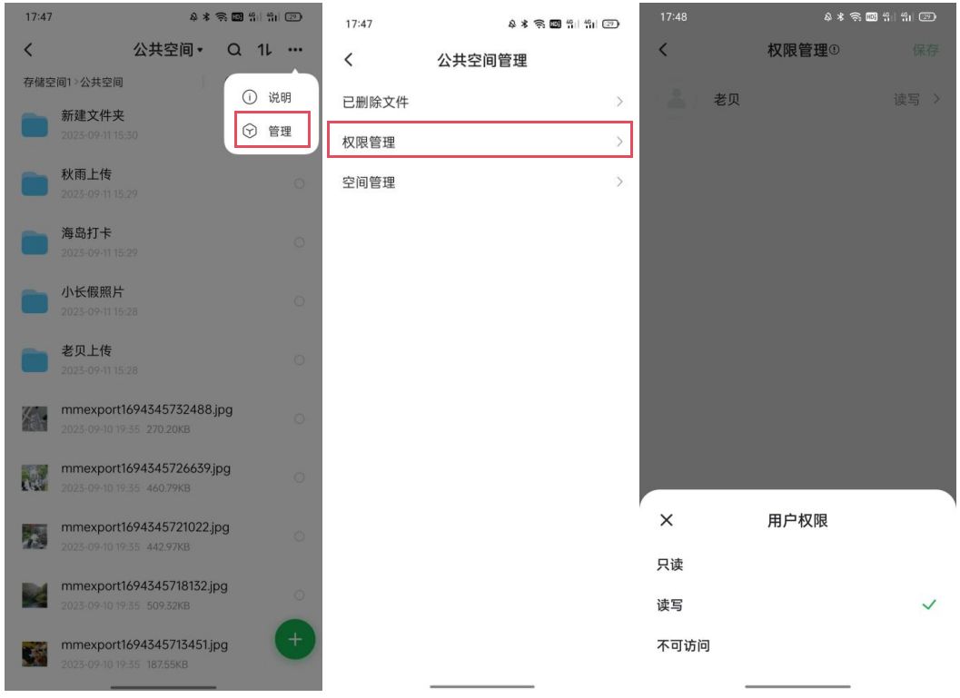 点击公共空间右上角三个点-管理-权限管理-读写