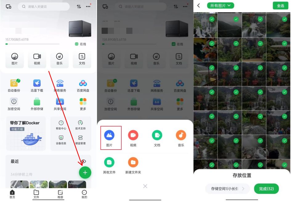 首先,我们要把照片上传到绿联私有云中,可以手动选择照片上传,也可以一键自动备份。