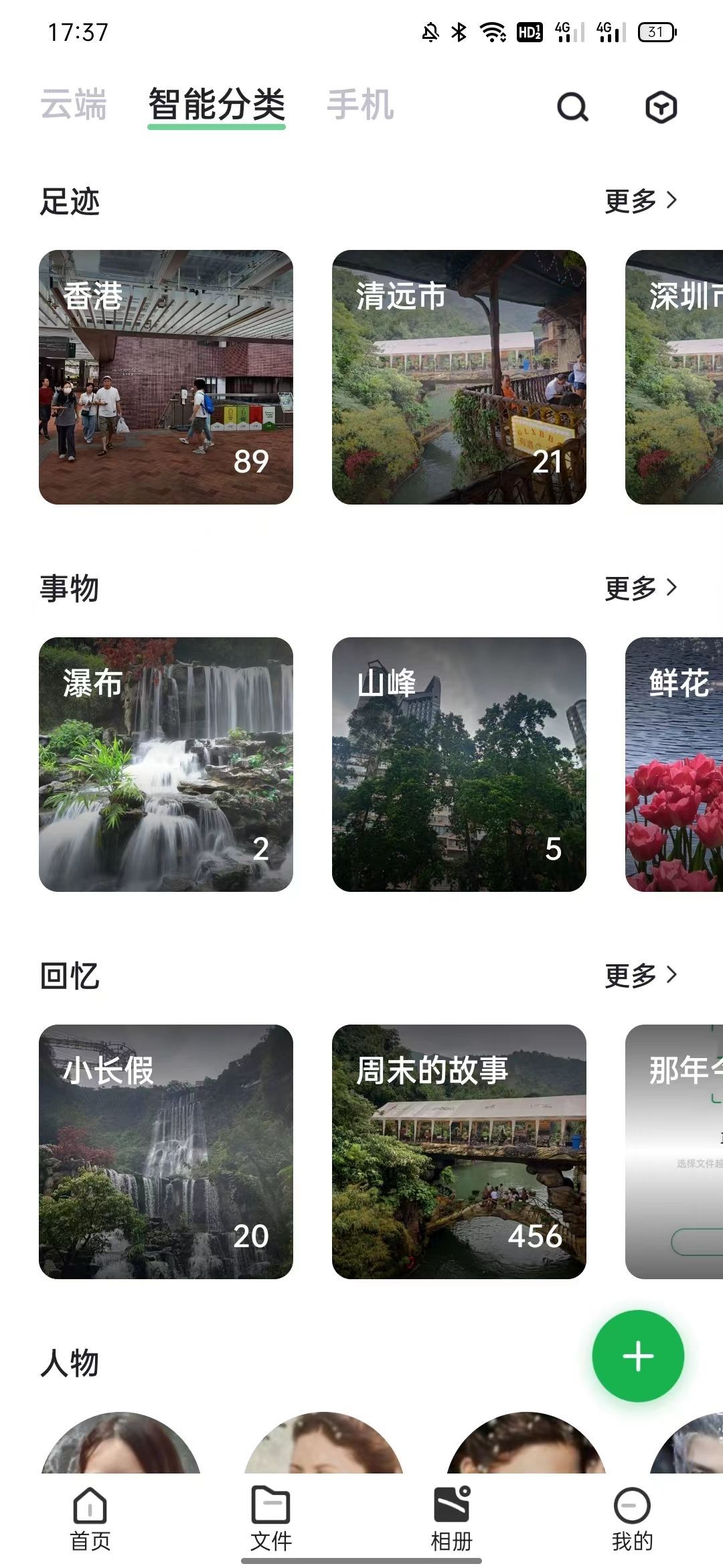 绿联云APP自带AI相册智能分类功能,能够将相册中的图片和视频按照时间、地点、人物、事物等进行自动归类,一眼就能找到想要的照片,非常方便。而且上传的照片质量不会像微信传输一样被压缩,导致画面不清晰,也不用担心文件过期什么的。