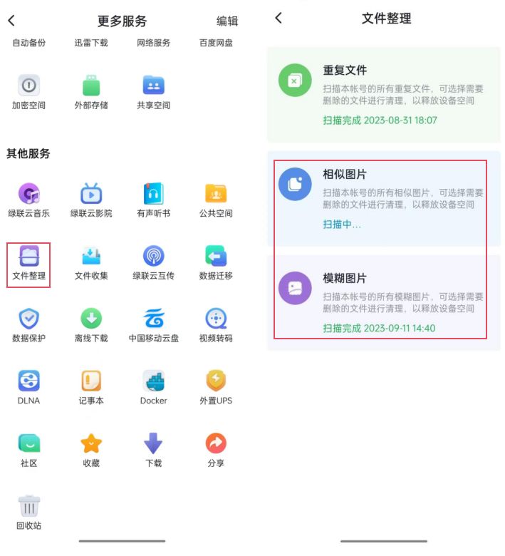 操作步骤:打开绿联云APP-更多-文件整理-相似图片/模糊图片-指定文件夹/全部图片-开始扫描