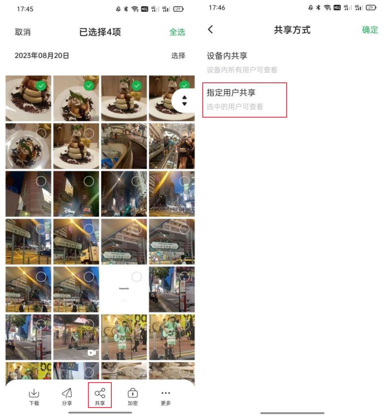 操作步骤:进入相册-选择图片-分享-指定用户共享