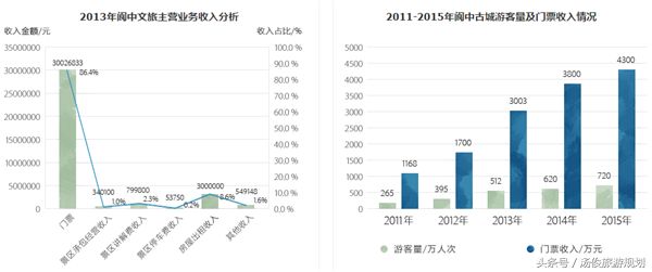 古城盈利分析:业态单一,观光经济。门票收入占比86%,休闲业态明显不足。留客不足,客单价低。客源85%来自于成渝陕区域市场,以家庭为单位的自驾游已超过70%,“回头客”景点消费少(人均门票消费仅6元),停留时间短(超过一半人当天往返),导致人均消费低至86元,远低于丽江古城的1452元。