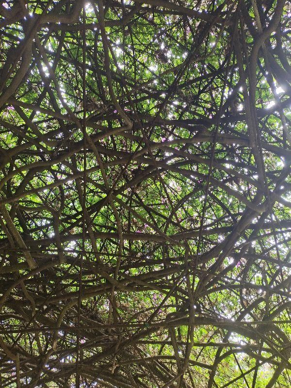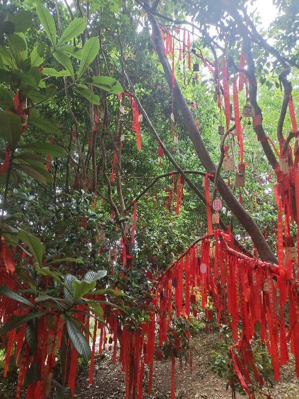 这是一片许愿树,挂满了愿望红带,有关于爱情、亲情、有钱、事业的愿望。