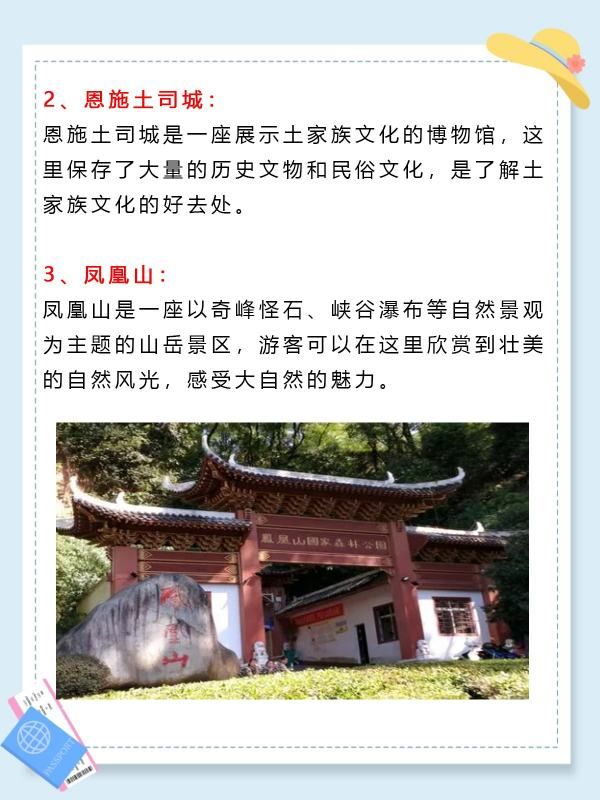 总之,恩施是一个自然景观与民族文化并存的地区,无论是喜欢自然风光的游客,还是对民族文化感兴趣的朋友,都能在这里找到心仪的旅游目的地。在游览恩施的同时,也不要错过品尝当地的土家美食,如手抓羊肉、酸汤鱼等,这些美食将为您的旅行增添更多的乐趣。
