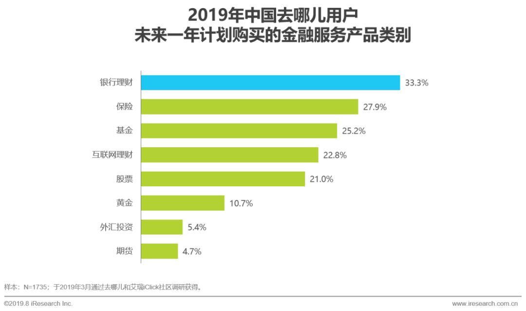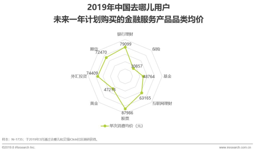 未来一年,去哪儿用户计划在银行理财、保险和基金方面的投入更多,目前经济形势下,银行理财投入相对稳健和安全,人均投资金额达到79099元。