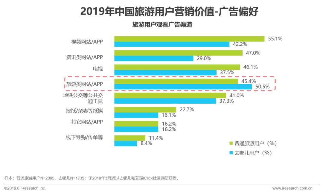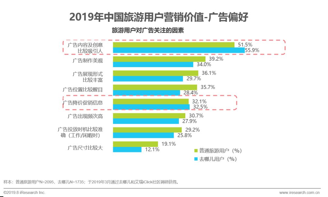 和普通旅游用户不同,50.5%的去哪儿用户在旅游类网站/APP观看广告,对于创意广告和降价促销类广告的关注度高于普通旅游用户。