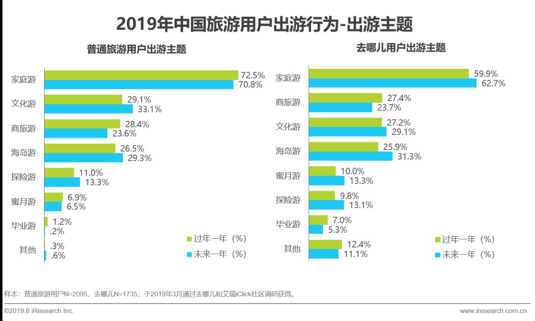 2019年中国旅游用户境外游增长意愿明显(增长率达63%)。用户出游类型多元化,家庭游是主力,未来休闲度假和深度文化游比例升高。