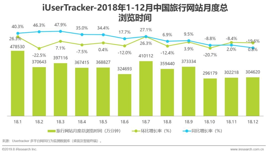 艾瑞iUserTracker数据显示,进入2018年以来旅游网站的月度浏览时间增幅逐步下滑,并在2018年10月出现拐点,开始低于2017年同期水平。