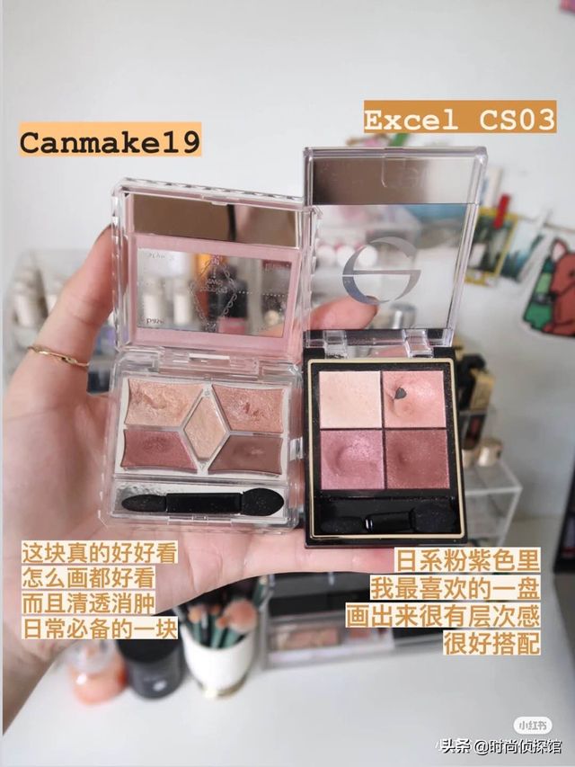 Canmake19这盘特别清透,虽然是微珠光但是也很消肿,我每次画都觉得好好看,有什么需要打扮的美美的场合都想要画这盘。Excel 这盘是我所有日系粉紫色里我比较喜欢的一盘,不会过于偏粉或者偏紫,而且配色很有层次感,画出来很好看
