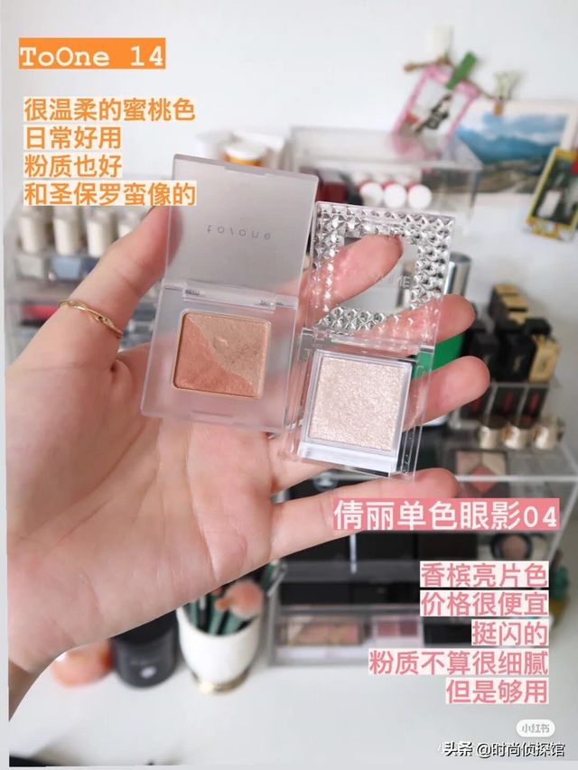 To one这盘双色和nars圣保罗有点像,都是蜜桃盘也很清透,好看自然。倩丽的单色眼影很便宜,缺亮片色的可以试试,香槟色调的