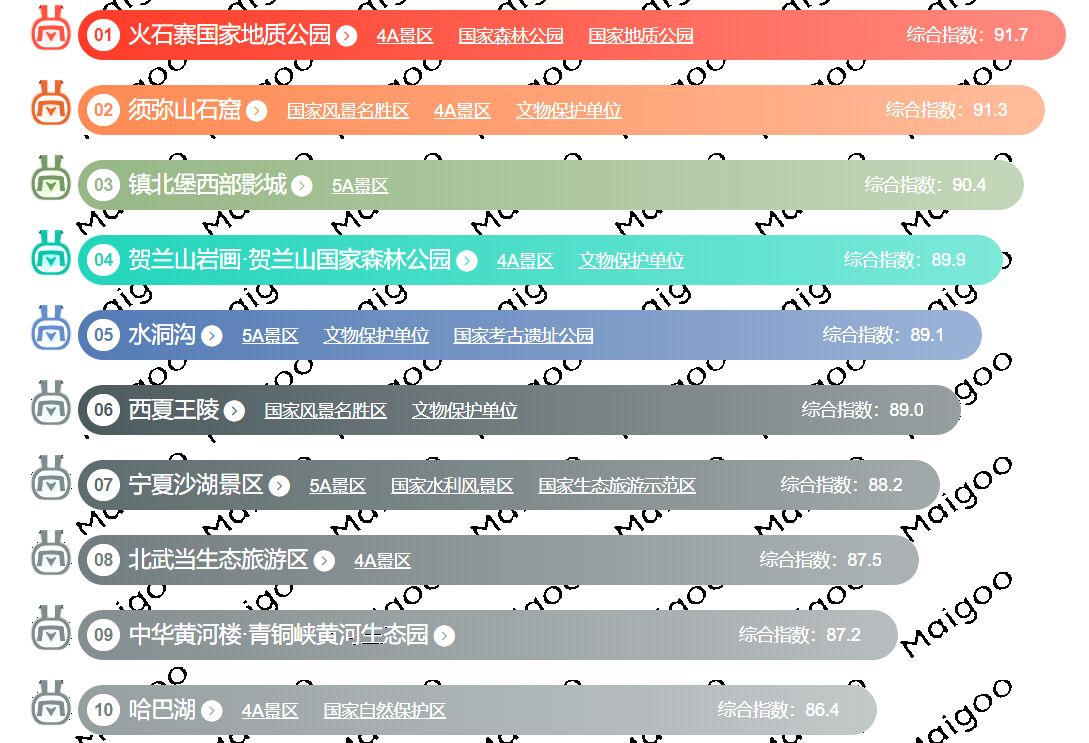 宁夏著名的景点排名第一的是火石寨国家地质公园,排名第二的是须弥山石窟,排名第三的是镇北堡西部影城。