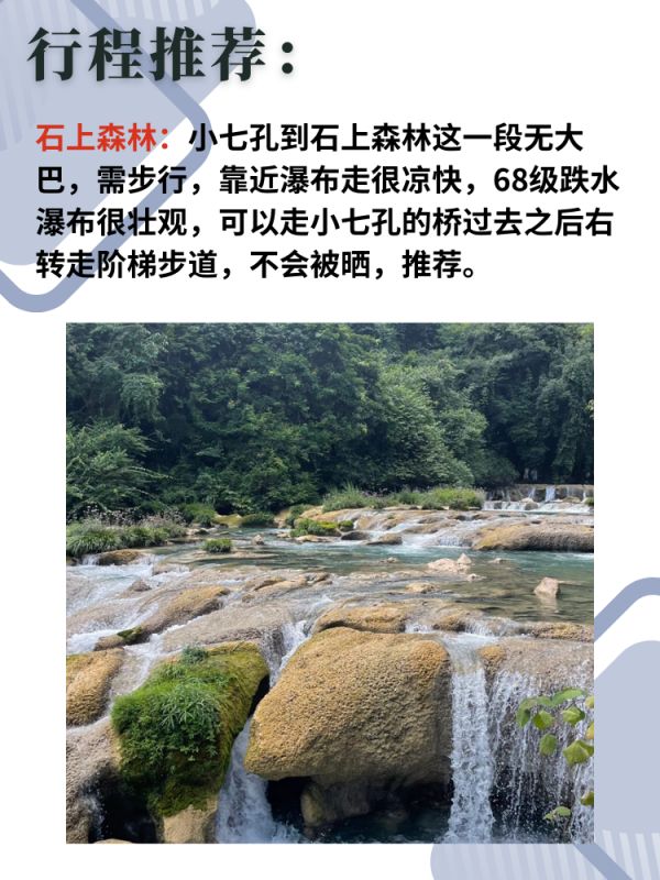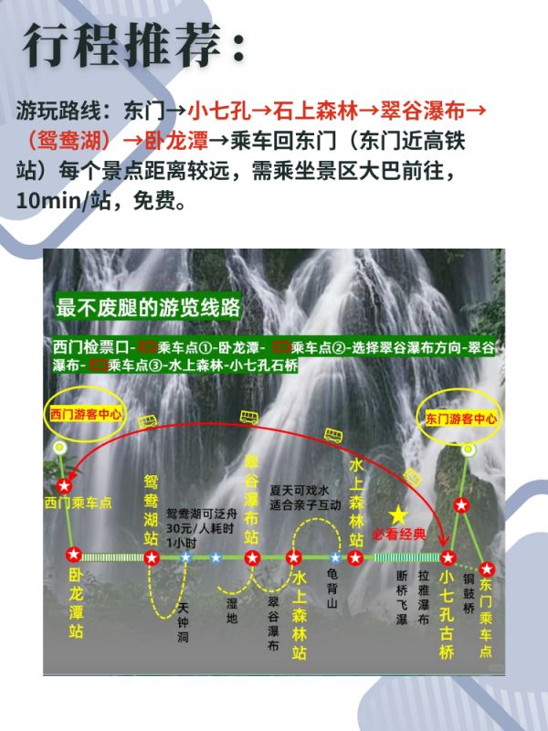 游览路线:最热门省力路线,东门→小七孔→石上森林→翠谷瀑布→(鸳鸯湖)→卧龙潭→乘车回东门。