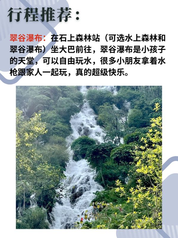 第3站:翠谷瀑布(30min),《跟着贝尔去冒险》同款打卡点。开阔热闹,可踩水,观瀑布,不用停留太久。
