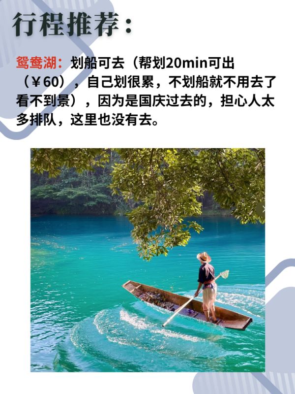 第4站:鸳鸯湖(60min),9月人不多,在这划船享受片刻静谧,很安逸~需单独买票,上湖:透明小船,50元/人 。拍照出片,但湖偏窄。下湖:铁皮船,30元/人。船丑但胜在湖大景好。