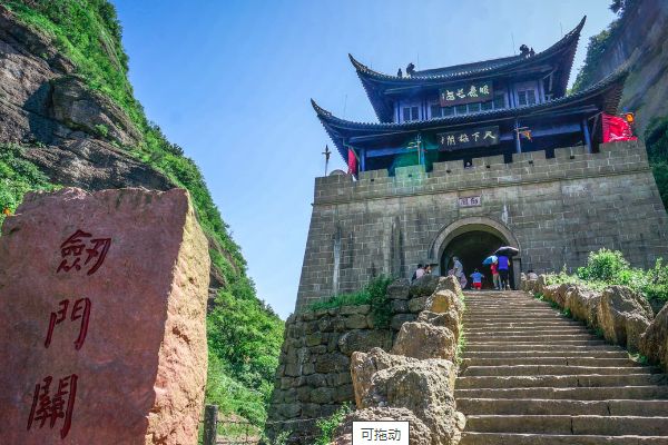 剑门关风景区,位于四川省广元市剑阁县河东街64号。剑门关居于大剑山中断处,两旁断崖峭壁,直入云霄,峰峦倚天似剑,绝崖断离,两壁相对,其状似门,故称“剑门”,有“天下第一雄关”之称。