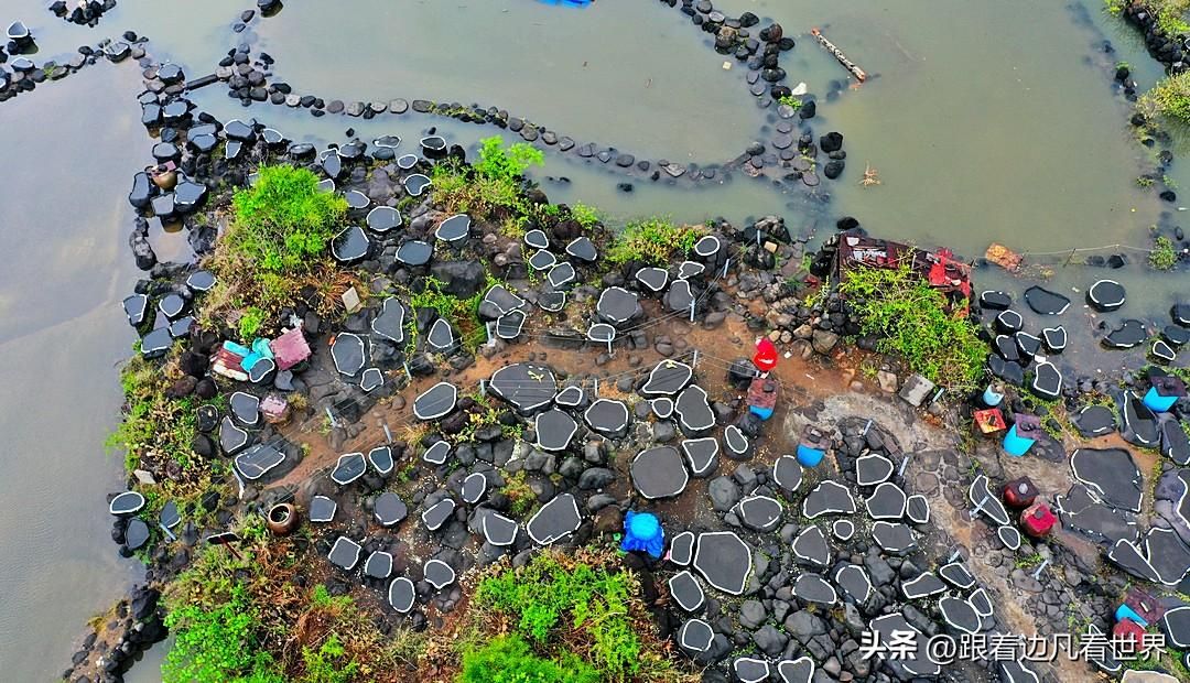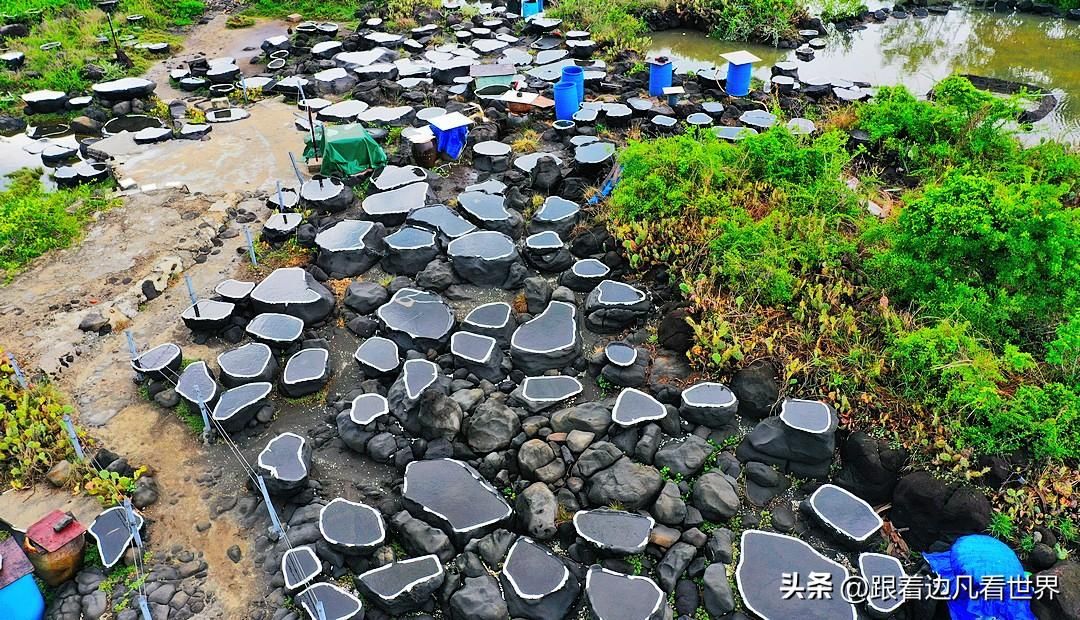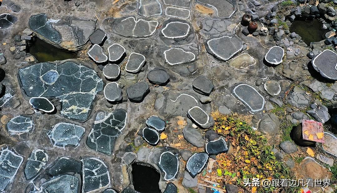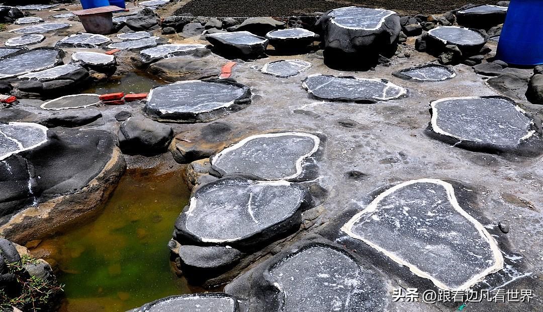 这些盐槽就像是精心雕琢的砚台,大小不一,它们是用当地的火山石在滩涂上雕刻而成的。
