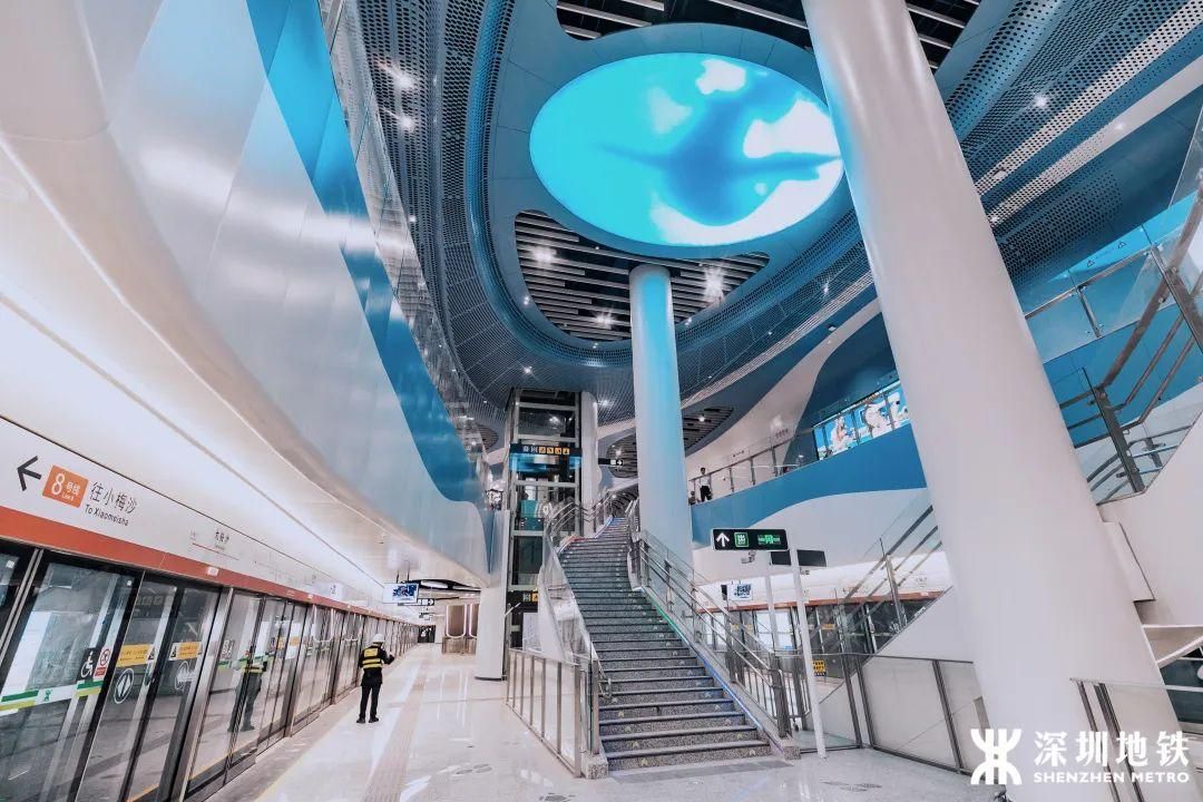 8号线二期工程整体设计以“山海如画,筑梦远航”为主题,每座车站也有着独特的主题风格。其中,大梅沙站以海蓝色鲸鱼造型为设计主题,站厅内抬头可见“布氏鲸”灯具、鲸鱼造型长椅,同时在采光天窗、地砖上设有海螺、贝壳、海龟等元素,浓浓的海洋艺术气息扑面而来。