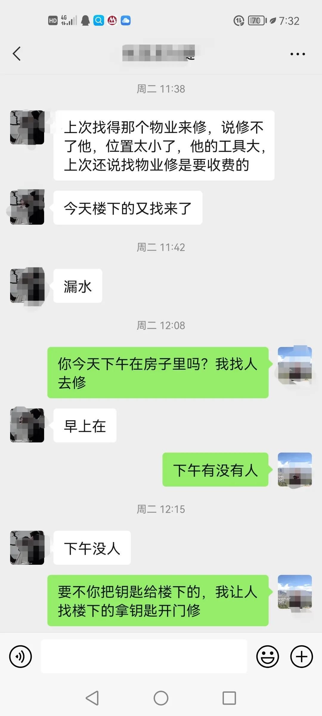 反观我在新疆所住小区的物业所作所为,真是令人寒心,遇有业主打电话提出需求,首先就是推拖,喜欢推来推去,回答总是“电工不在,你下午再打电话”。“人都去干活了,过几天有时间再去给你修”。“反正我们也要收费,要不你找外面社会上的人修吧,还快一点。”前几天,我在新疆小区的租户给我打电话给我说有水管接头处漏水了,我让他去找小区物业修理,最后,接到他的微信说:小区物业说修不了,位置太小,他的工具大了。无奈之下,我从远隔万里之外的威海给新疆库尔勒当地打电话,找社会上的维修人员一去就修好了,在小区里的物业离我房子不到50米,修不了,让业主多花了50元的上门费找外面的修,我觉得物业真不应该这样做工作,业主都正常交着物业费,业主的诉求其实也很简单,提供一个干净卫生的家,及时维修水电暖发生的小问题,物业却是这种工作态度,让人无语了。我告诉租户,以后把所有物业的不作为、懒政都拍照或者是录音,保留下证据,为我下一步拒绝交物业费作好准备。