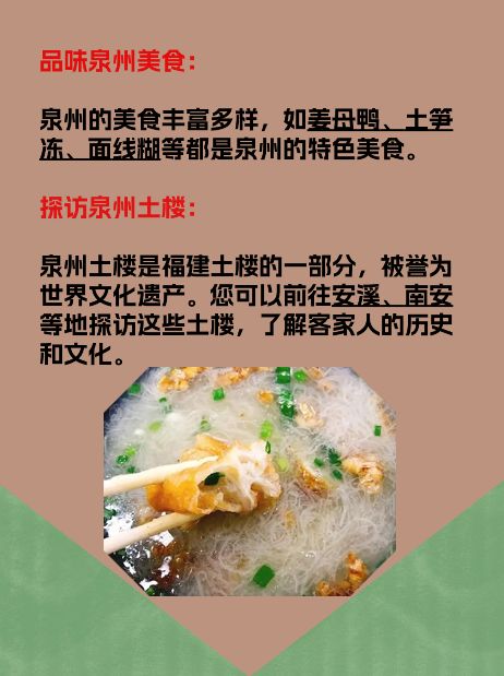 1. 泉州特色小吃:泉州有许多著名的特色小吃,如鱼丸、肉粽、沙茶面等。你可以在当地的小吃摊位或餐馆品尝到正宗的泉州美食。
