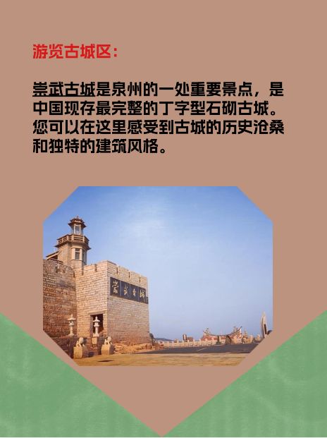 游览古城区:崇武古城是泉州的一处重要景点,是中国现存最完整的丁字型石砌古城。您可以在这里感受到古城的历史沧桑和独特的建筑风格。此外,您还可以游览开元寺、西街等景点,了解泉州的历史文化。