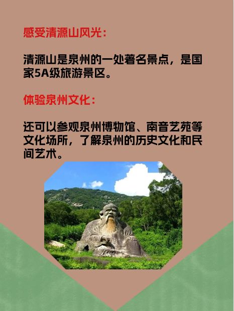 感受清源山风光:清源山是泉州的一处著名景点,是国家5A级旅游景区。您可以在这里欣赏到壮丽的山水风光和丰富的历史文化。例如,您可以游览老君岩、千手岩等景点,感受山水的灵动与神韵。