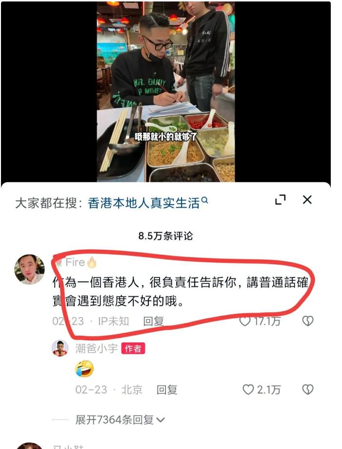 我看了一下香港网友的评论:这是在香港说普通话的后果。他们说,在香港,如果你说普通话,就会被人歧视,就会被人冷落,就会被人欺负。他们说,在香港,你要么说英语,要么说粤语,要么闭嘴。这样的话,真是让人心寒啊。