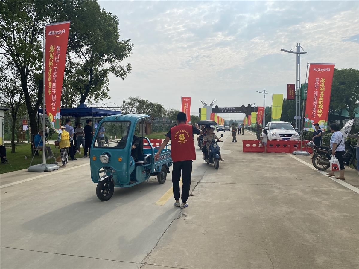 “您好,车辆请停放在这边。”“不要随地乱扔垃圾”“看好自己的小孩注意安全。”在朴甜·生活田园入口处,志愿者正身穿红马甲,协助景区工作人员维护现场秩序,提醒游客停放好车辆,引导游客有序进入景区。