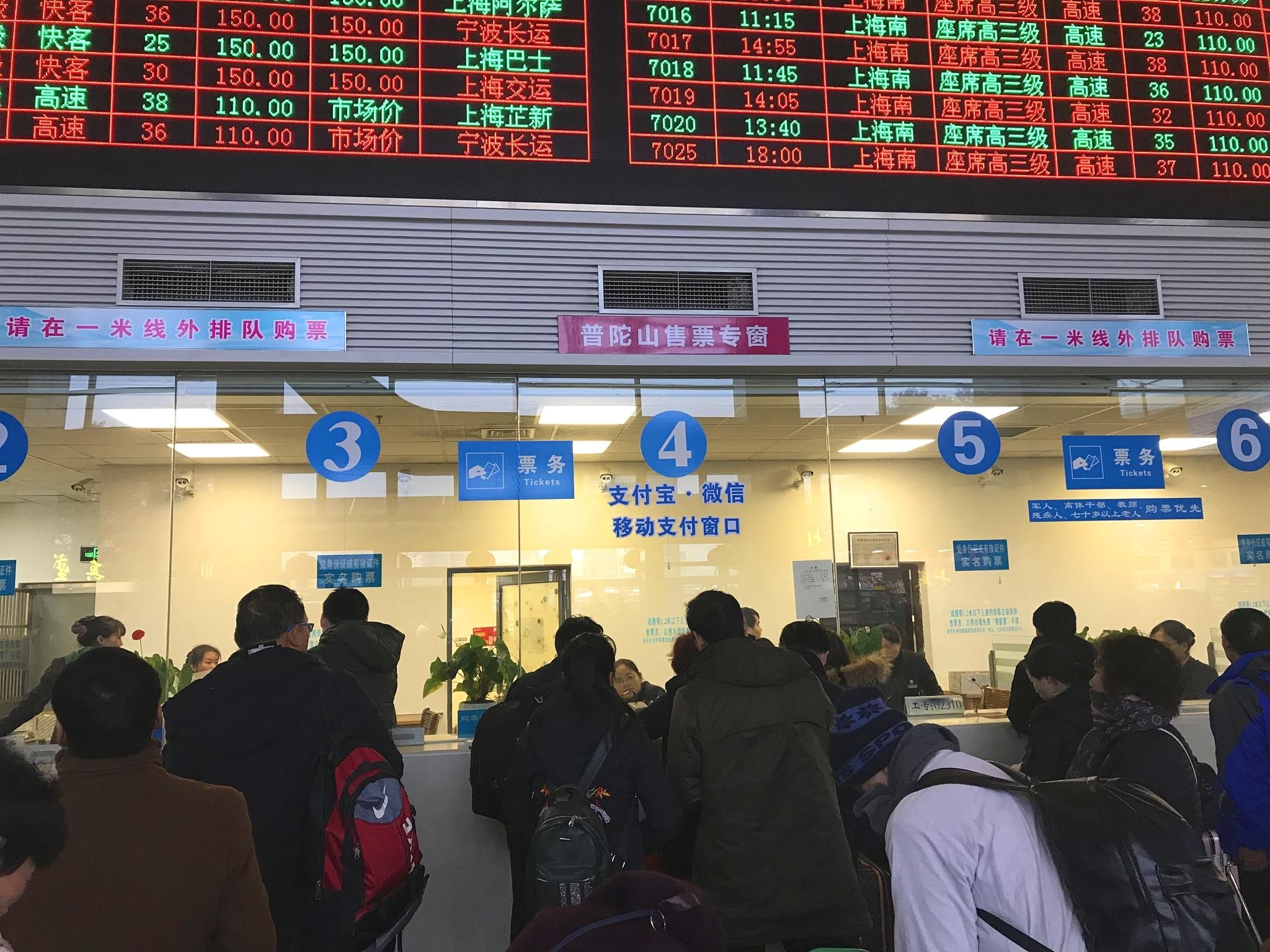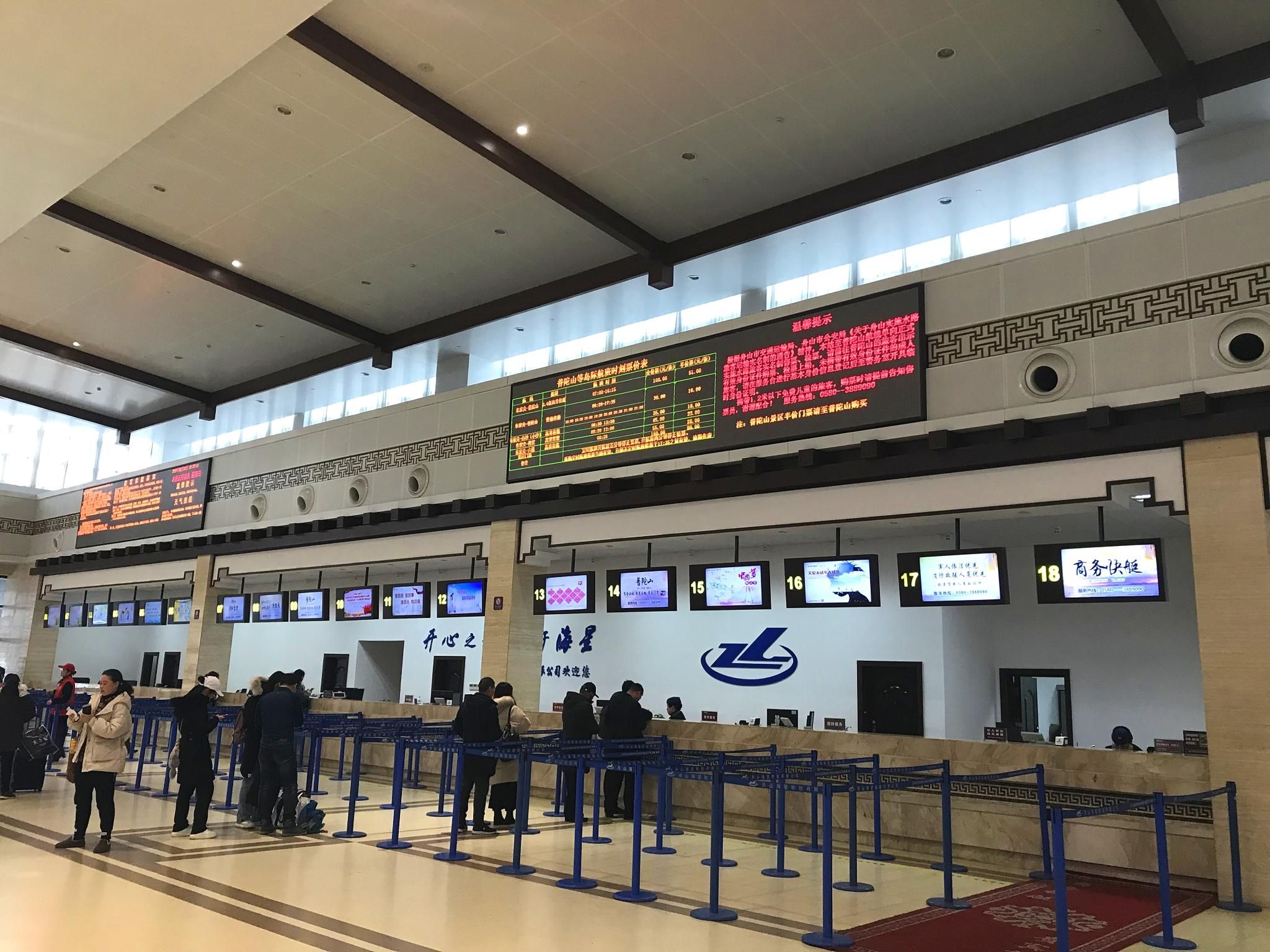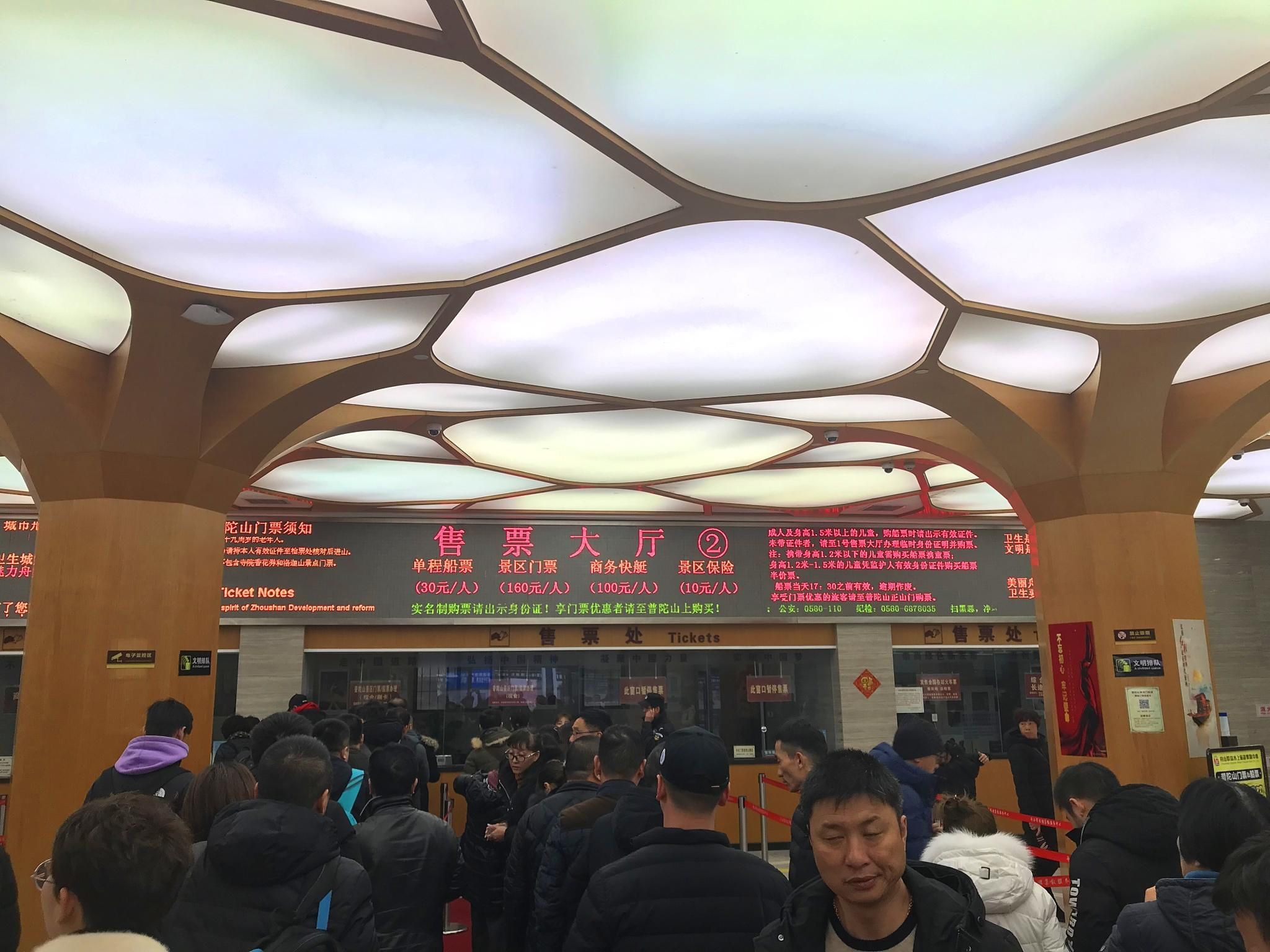 在候船区里还有一处售票大厅,这里有朱家尖客运中心商务快艇专属售票窗口,购买商务快艇船票,票价100元一位,方便快捷。