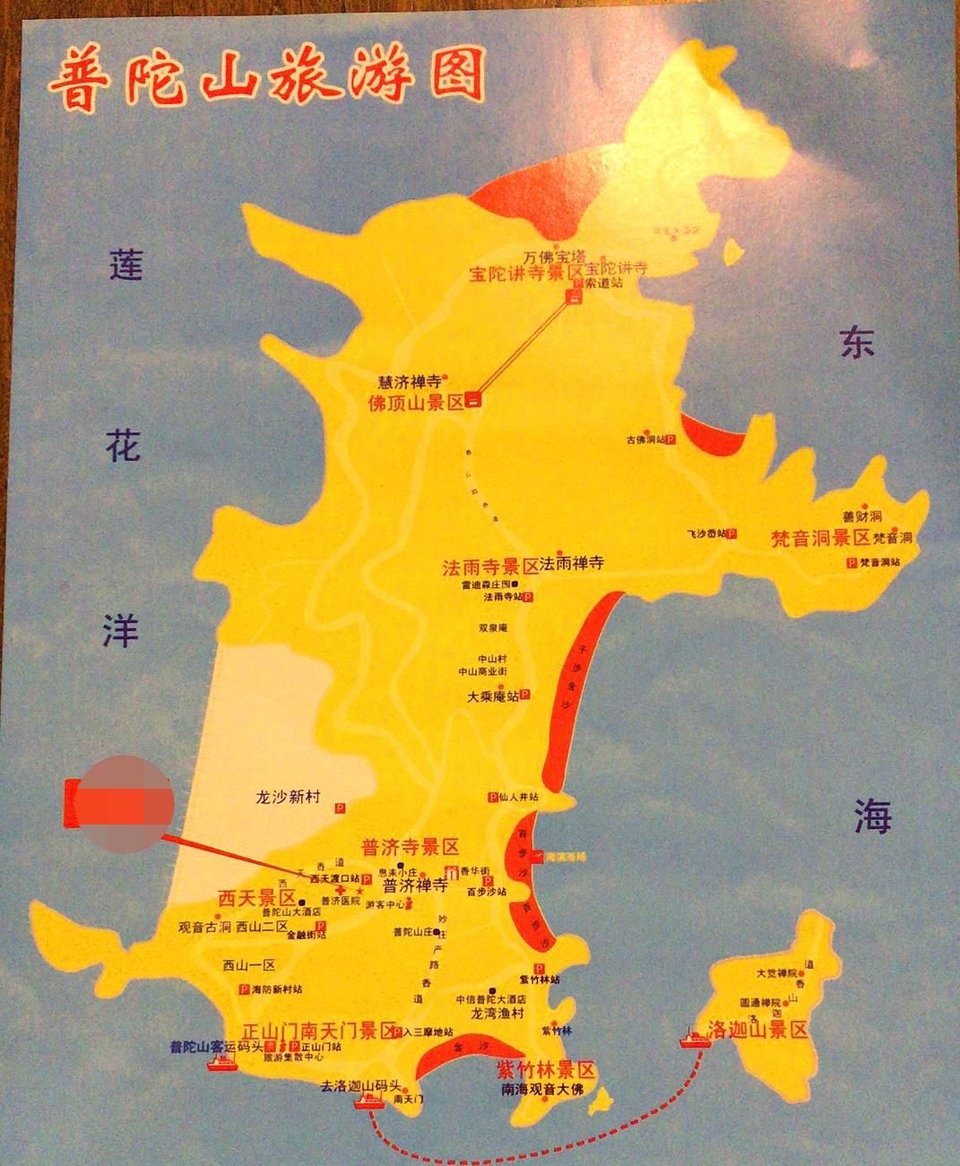 简单说一下普陀岛的一日游常规游玩线路。普陀岛并不大,刚上岛时有点蒙圈,这很正常。拿到手里一张这样的游览图,我们看一下。普陀山从上到下的景区有佛顶山、法雨寺、梵音洞、普济寺、西天景区、紫竹林、南海观音。游览线路很简单,一日游时间较紧张,要坐车和索道,才能一一玩到。