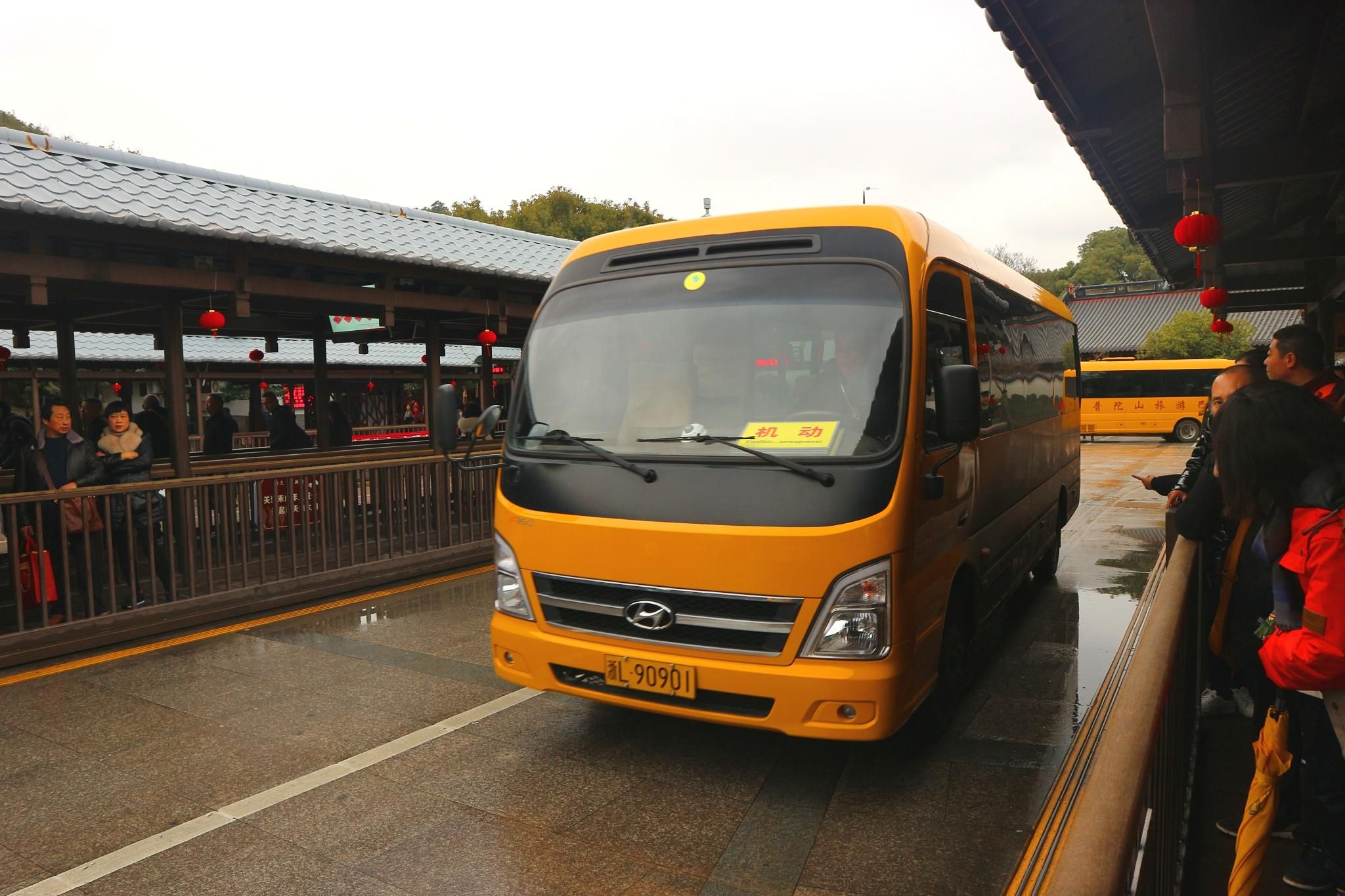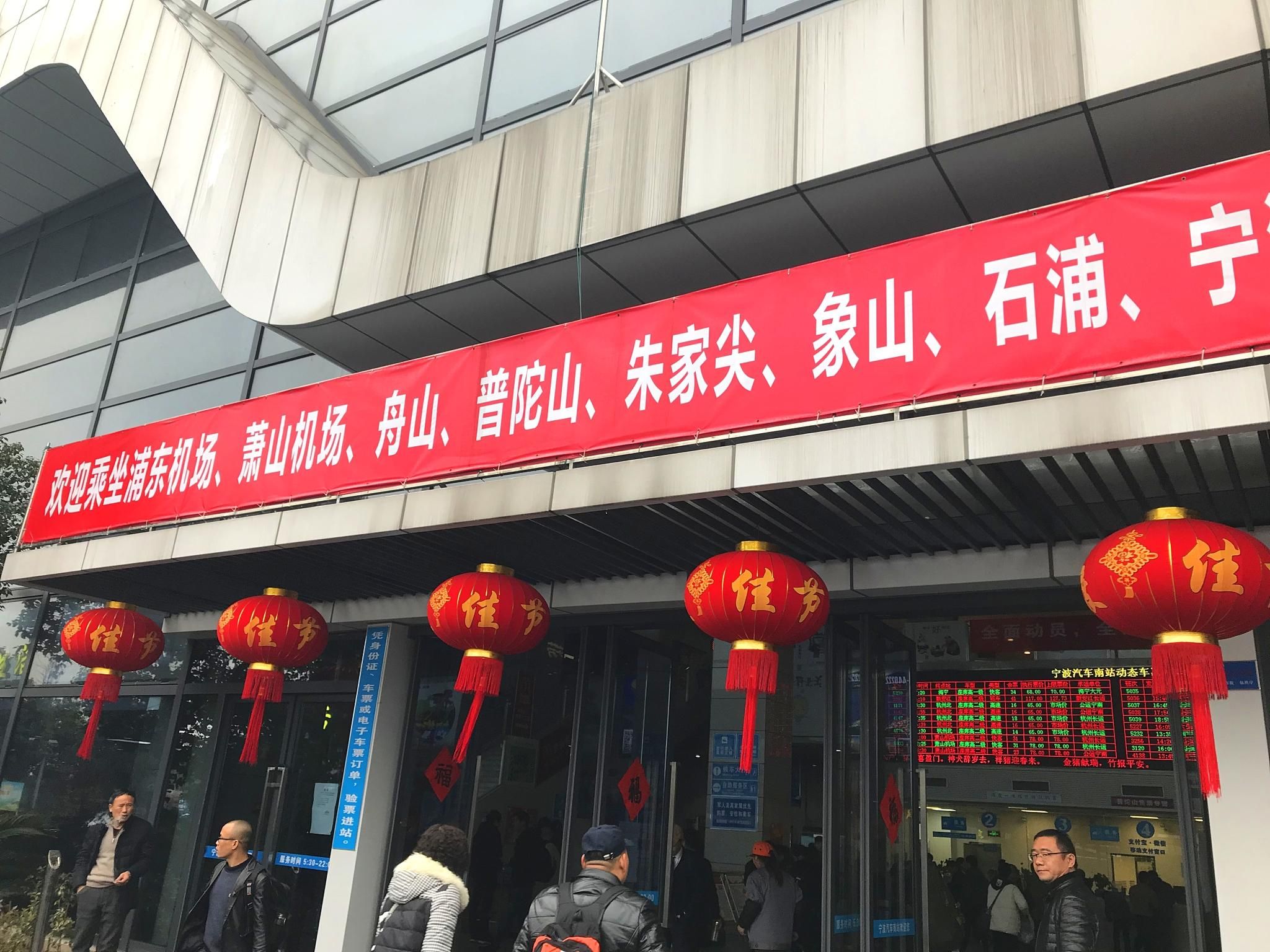别的线路暂时忽略,看看这几条我们感兴趣的线路,汽车南站有可直达上海和杭州机场的直达班车,是不是很方便。我们今天要乘坐的是直达朱家尖码头的班车,商务座票价72元,保险4元,车程近2小时。至于条幅上写着的普陀山,其实就是一张到达朱家尖码头的车票和到普陀山的船票的联票。