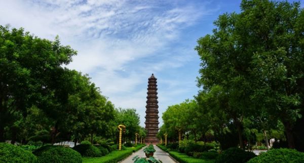 铁塔素有“天下第一塔”的美称,建于公元1049年,塔高约55.88米,八角十三层,因遍体通彻褐色琉璃砖,混似铁铸,称铁塔。