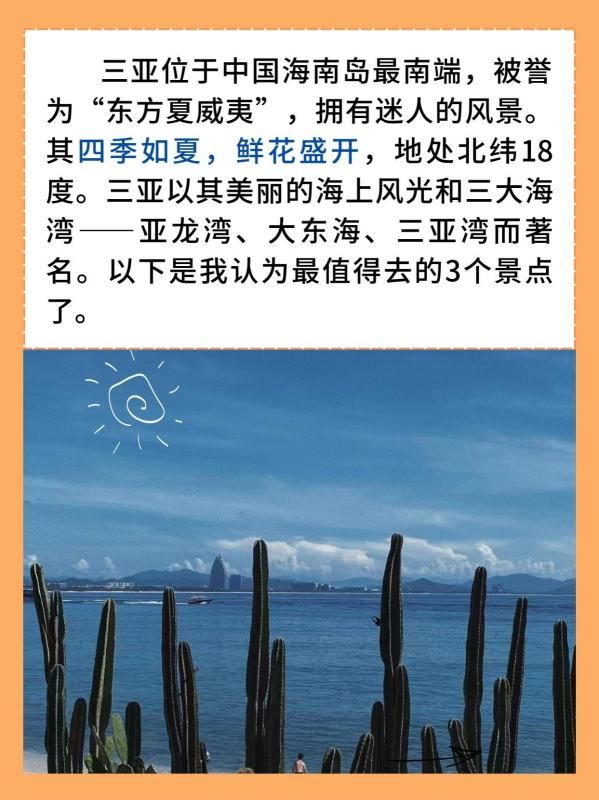 三亚位于中国海南岛最南端,被誉为“东方夏威夷”,拥有迷人的风景。其四季如夏,鲜花盛开,地处北纬18度。三亚以其美丽的海上风光和三大海湾——亚龙湾、大东海、三亚湾而著名。以下是我认为最值得去的3个景点了。