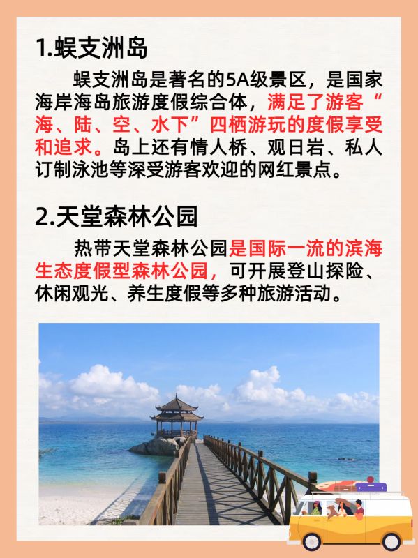 蜈支洲岛是著名的5A级景区,是国家海岸海岛旅游度假综合体,满足了游客“海、陆、空、水下”四栖游玩的度假享受和追求。岛上还有情人桥、观日岩、私人订制泳池等深受游客欢迎的网红景点。