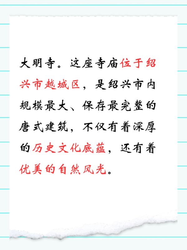 首先,我们不能错过的是大明寺。这座寺庙位于绍兴市越城区,是绍兴市内规模最大、保存最完整的唐式建筑,不仅有着深厚的历史文化底蕴,还有着优美的自然风光。在这里,你可以感受到古建筑的韵味和历史的沉淀。