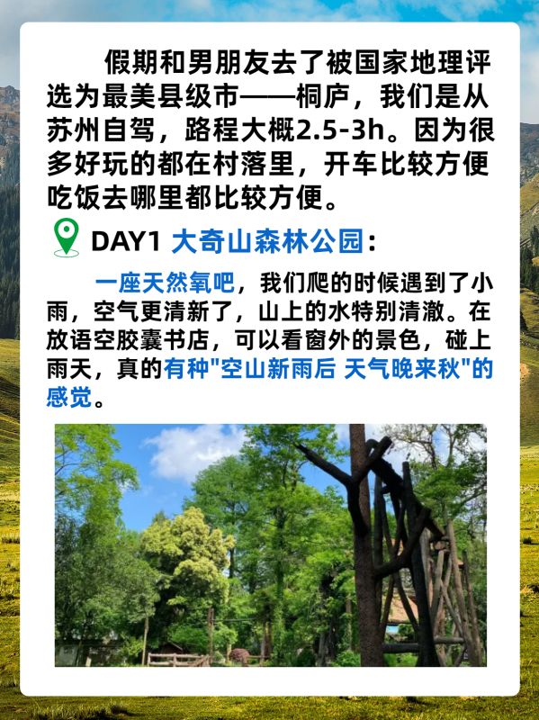 假期和男朋友去了被国家地理评选为最美县级市——桐庐,我们是从苏州自驾,路程大概2.5-3h。因为很多好玩的都在村落里,开车比较方便,吃饭去哪里都比较方便。